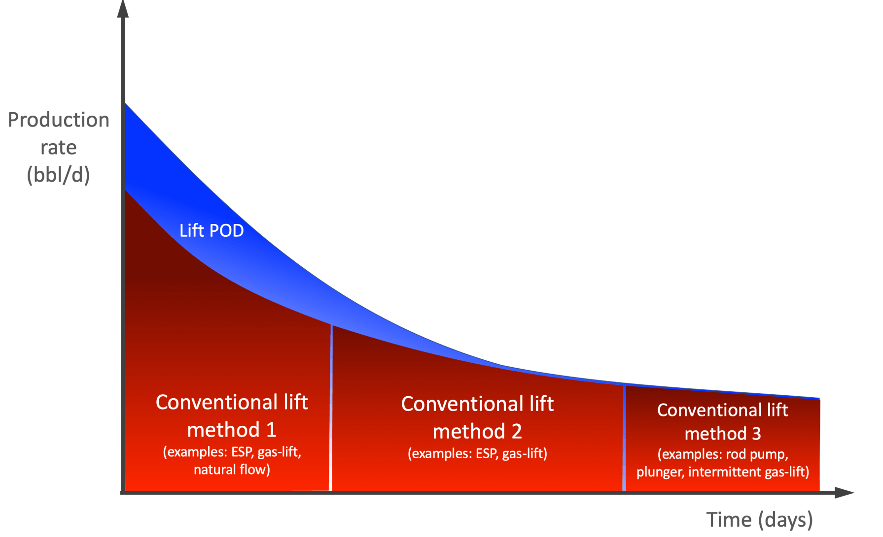 And you don't need to worry about designing and installing different artificial lift methods over the life of the well. The Lift POD gives larger or equal production rates for the entire life of the well.