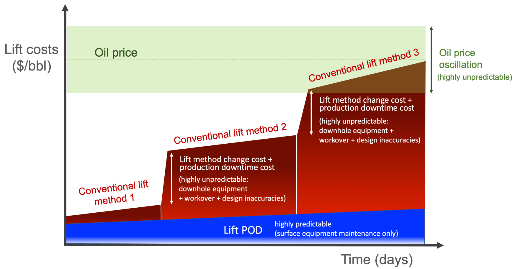 And you don't need to worry about designing and installing different artificial lift methods over the life of the well. The Lift POD gives larger or equal production rates for the entire life of the well.